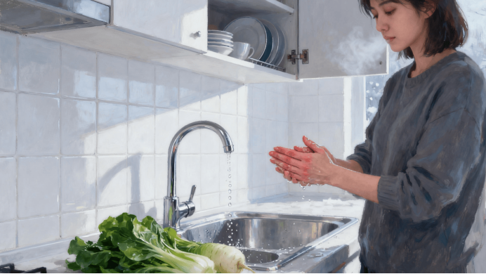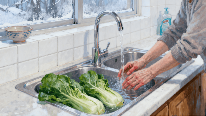 剛從冰箱拿出的青菜、蘿卜,泡進冷水里清洗,雙手像伸進冰窖,沒洗5分鐘就凍得僵硬,連菜葉子都捏不穩,只能時不時搓手哈氣取暖,一頓飯做下來,手又紅又腫。